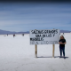 - El tercer cartel enumera todo lo que “mata” la desfinanciación: ARSAT, INAI, CAREM, CONICET, ENERC, Gaumont, INCAA, Banco Nación, Aerolíneas, Hidrovía, agua, gas, litio, tierras raras, petróleo, educación. Una enumeración del saqueo.