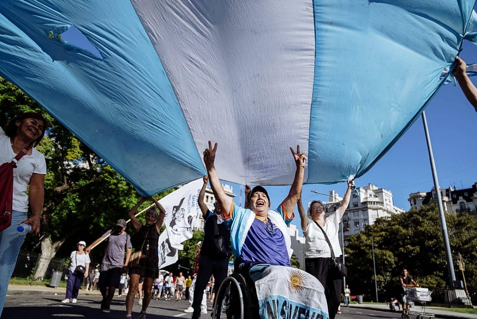 Estela, 63 años, también de Avellaneda, es más práctica: “La CGT está comprada”. También se indigna con los partidos políticos: “No hay unión”. Se embronca con algunos que no están en esta calle, en este cara a cara con la policía –como ella–, o con la bandera argentina que utiliza como capa, o con ese sombrero Piluso que tiene un cartelito que la pinta de cuerpo entero, aunque se le dibuja una sonrisa: “Jubilados testarudos”.