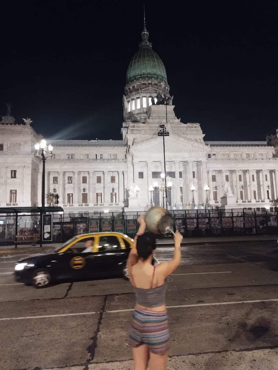 Llegamos, finalmente, al frente del Congreso, con Roxana y sus nietos, con Adela y su bebé, con Martín y su hermana, Adriana con Ornella –secretaria general de la Federación Argentina LGTB- y otras cien, quizá doscientas personas que hacen sonar cacerolas mientras cantan el clásico “Que se vayan todos”. Los autos suman sus bocinas, los camiones de basura su saludo y los transeúntes, sus miradas de aprobación. No hay, durante una larga hora, nada que altere esa protesta pacífica, certera, escasa, sostenida ruidosa e ininterrumpidamente por gente que lleva la bandera argentina colgada del cuello, sacudida por el viento en la espalda o camisetas de la selección con el número diez y el nombre de Maradona o Messi.