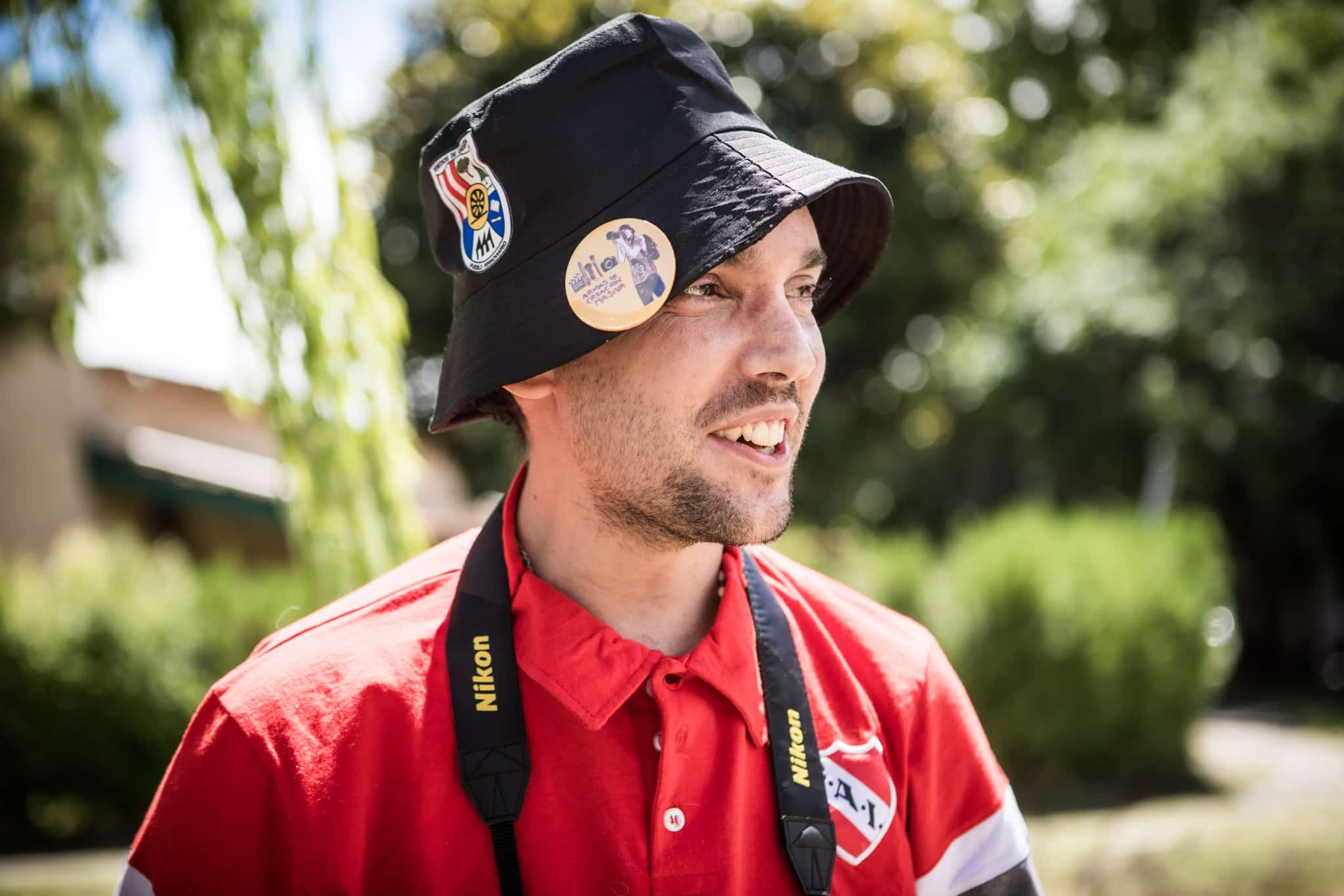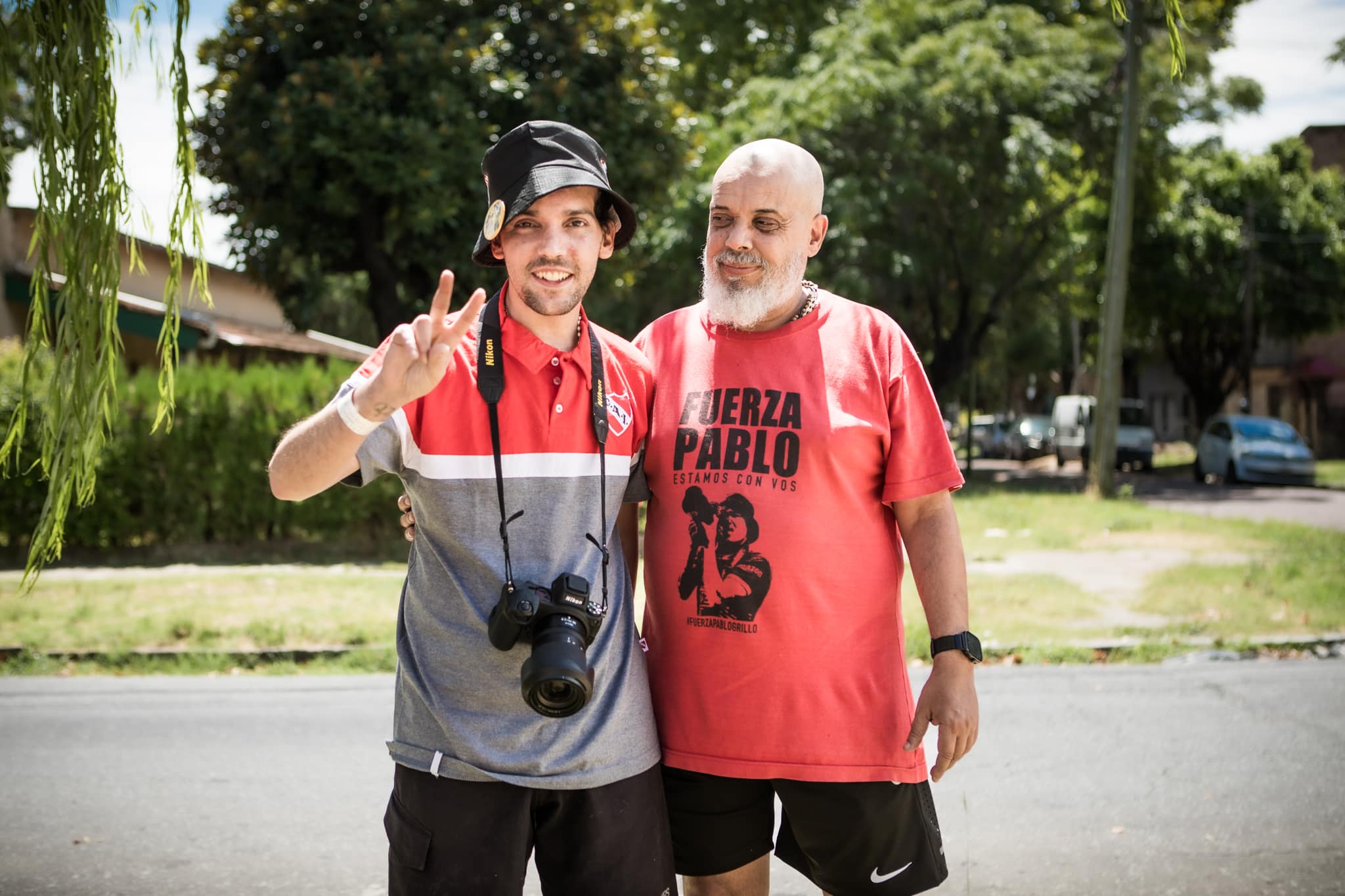 Pablo lleva puesta la chomba de su amado Independiente y un gorro Piluso de Remedios de Escalada, del que prende el pin con su foto icónica y la frase de su ídolo Ricardo Mollo sobre esa cámara de fotos que Bullrich y compañía buscaron que deje de disparar: “Un arma de creación masiva”.