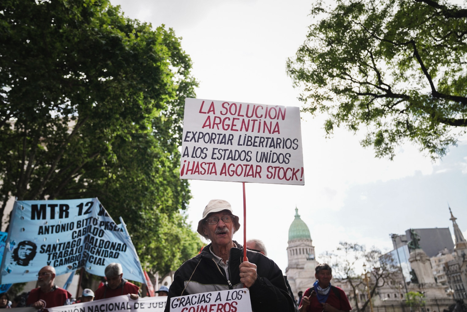 Eduardo tiene 79 años, cumple 80 el 30 de marzo. Leva un gorro piluso y un cartel que es una propuesta de comercio exterior: “La solución argentina: exportar libertarios a los Estados Unidos ¡hasta agotar el stock!”