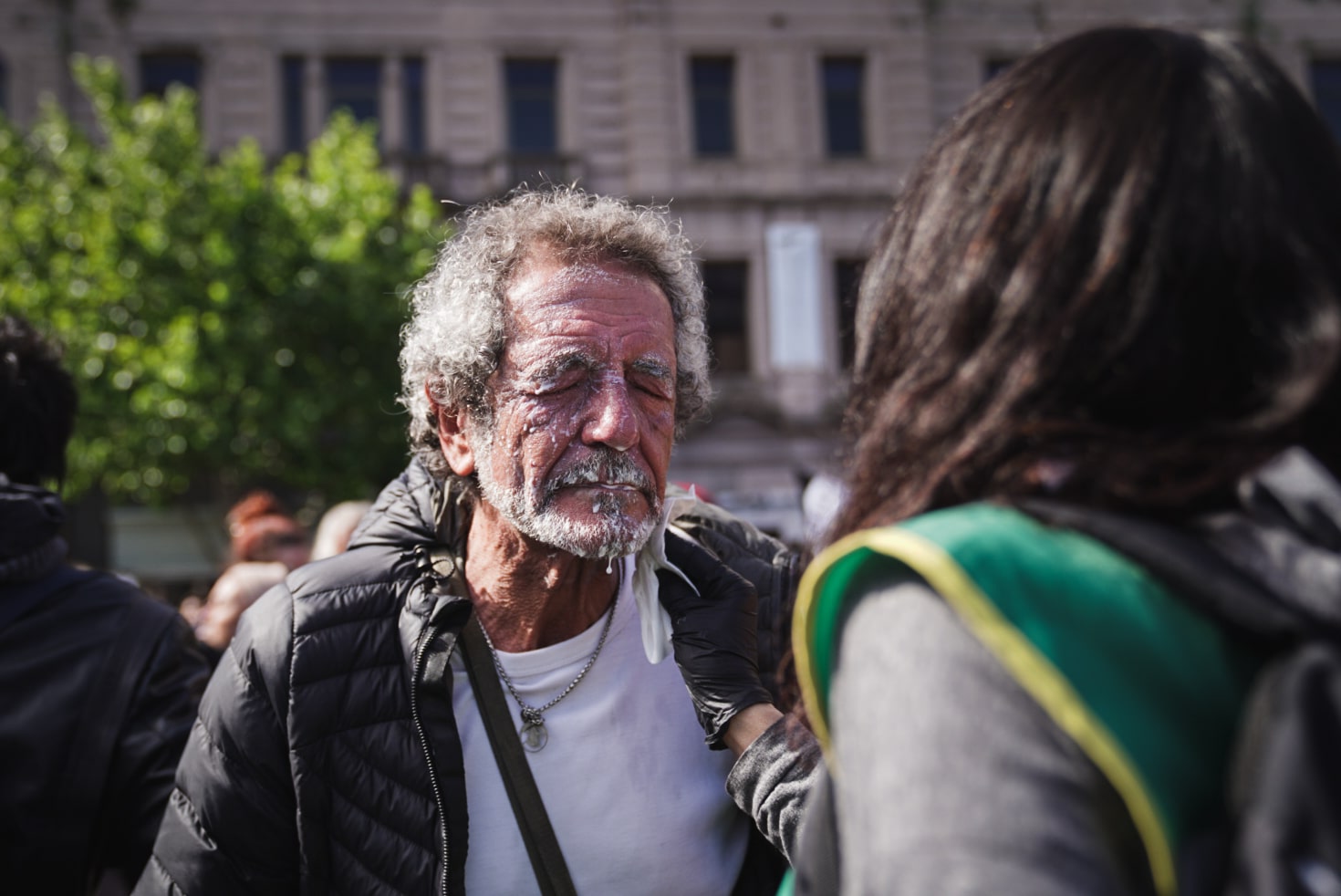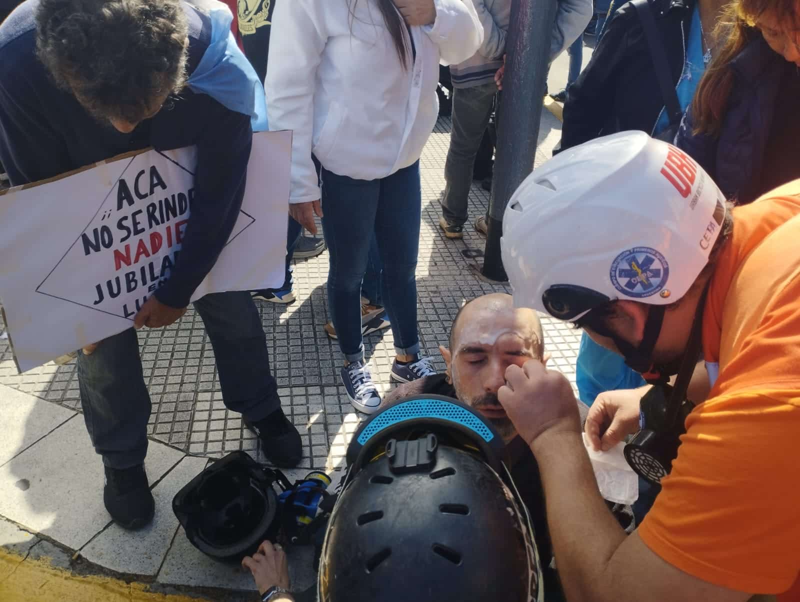 “Nosotros no podemos esperar mucho, no podemos esperar 30 años, no puedo esperar más, no puedo esperar más”, repite. Deja de contar su historia no solo porque llegó hasta hoy (y hasta un límite) sino porque la multitud a su lado se empieza a agitar. Qué pasa: la Policía Federal se encapricha con encosertar a los miles de manifestantes arriba de una vereda de 4 metros de ancho. Otra muestra del intento de aplicar un protocolo absurdo en el cual la propia policía termina cortando el tránsito y generando empujones que derivan en hechos violentos, como el que vivió Tabaré, 57 años: lo acaban de gasear en la cara.