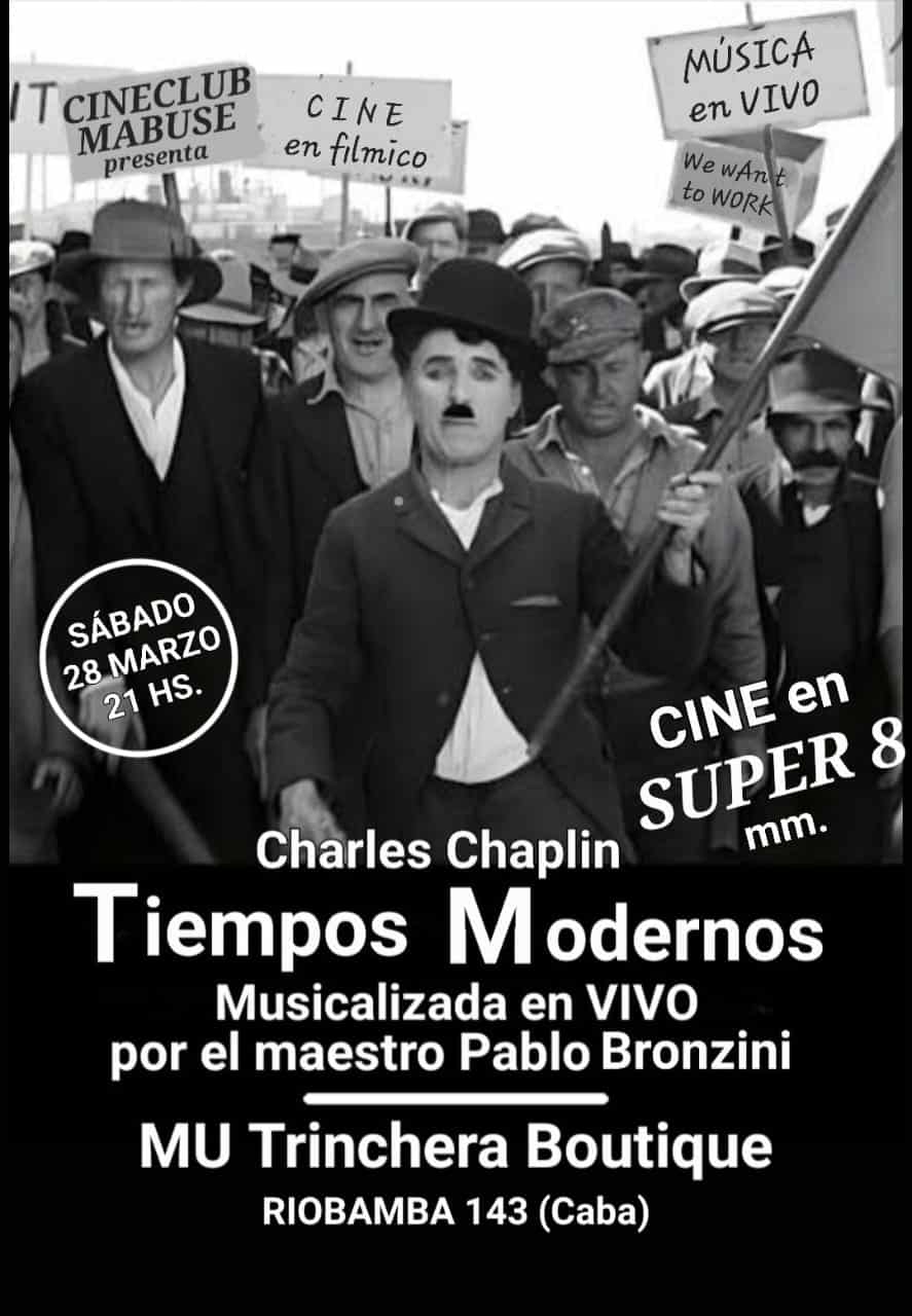 En este primer encuentro cinematográfico en MU Trinchera Boutique, el sábado 28 de marzo a las 21, se podrá ver nada menos que Tiempos modernos, de Charles Chaplin, posiblemente más vigente que nunca en tiempos de destrucción y precarización del trabajo. Será proyectada en fílmico, en formato Super 8 milímetros, en su versión completa de cuatro rollos, con música en vivo compuesta e interpretada especialmente para la ocasión por el maestro Pablo Bronzini.