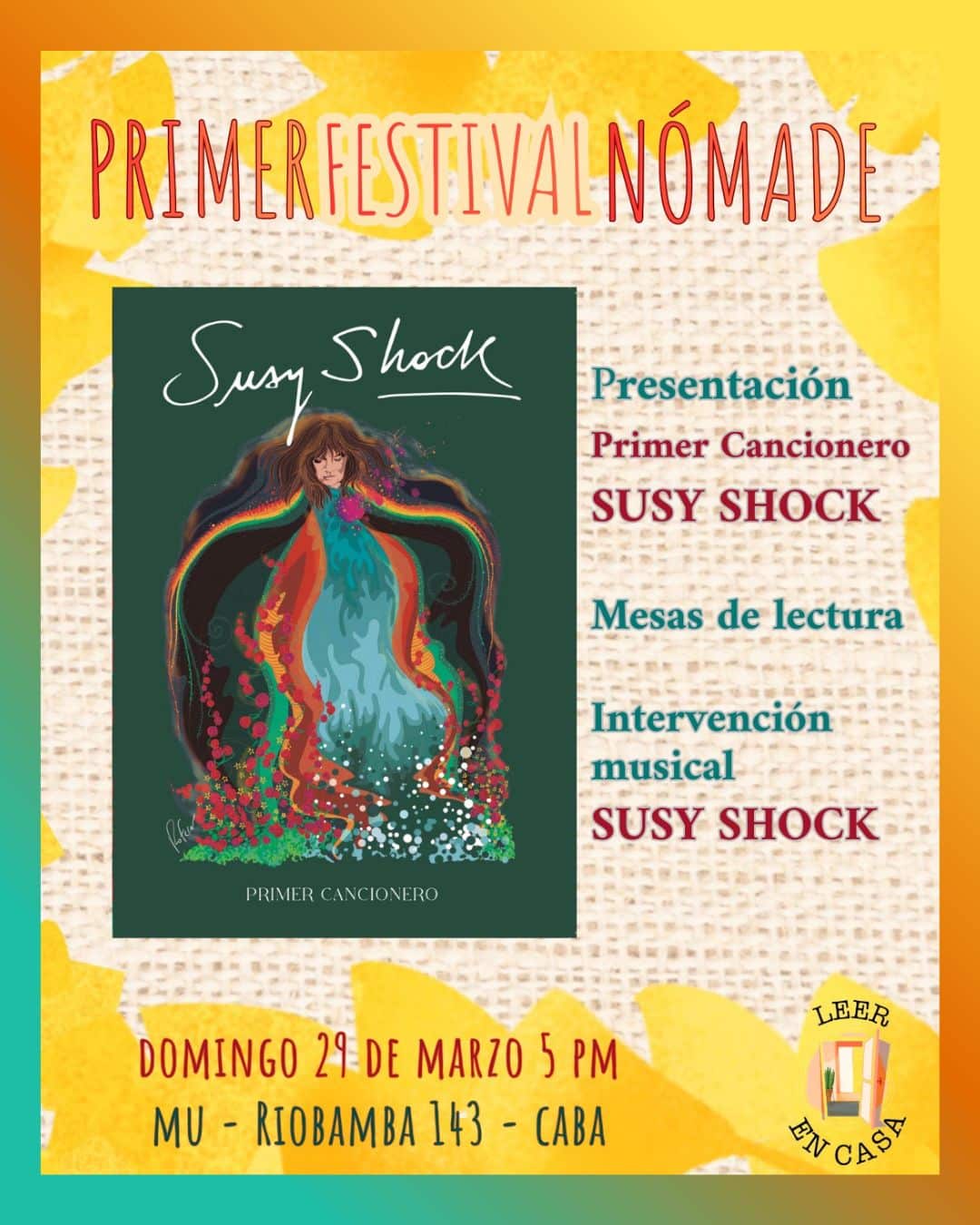 Como consecuencia material de esta aventura poética, surgió Leer en Casa Editoras, que reúne las voces que fueron apareciendo en el camino y sumaron su potencia creadora. Este fin de semana se llevará a cabo el Primer Festival Nómade que tendrá en cada fecha un espacio diferente. El domingo en MU Trinchera Boutique será el cierre a partir de las 17 hs y se presentará el Primer Cancionero de Susy Shock, realizado en forma colaborativa entre Leer en Casa Editoras y Cóndora Ediciones.