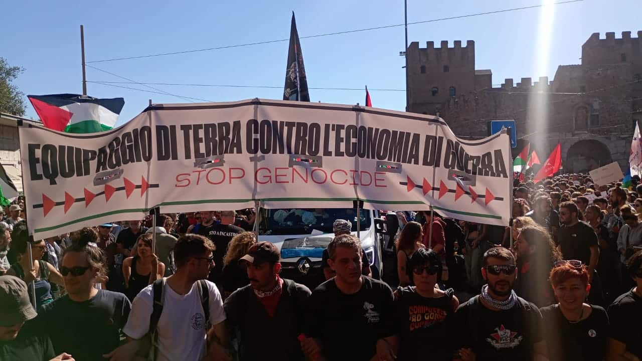 Los camiones de sonido anuncian la llegada de nuevas columnas: “En este momento está llegando el movimiento migrante de Abruzzo”. La gente aplaude. Y aplaude más cuando se informa que algunos de los detenidos de la flotilla están siendo liberados en ese momento.