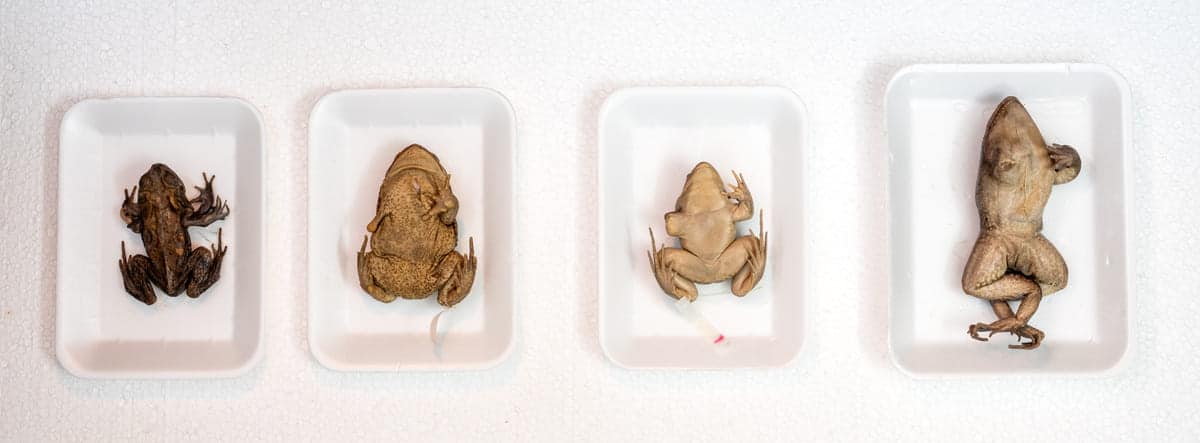 Dos ranas criollas con miembros retenidos que no terminaron de salir del cuerpo.