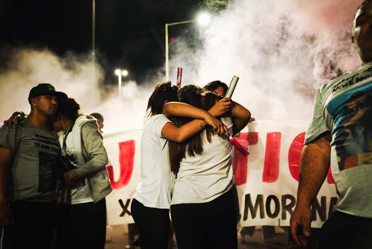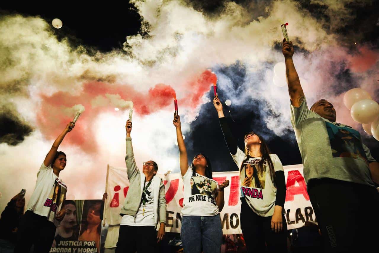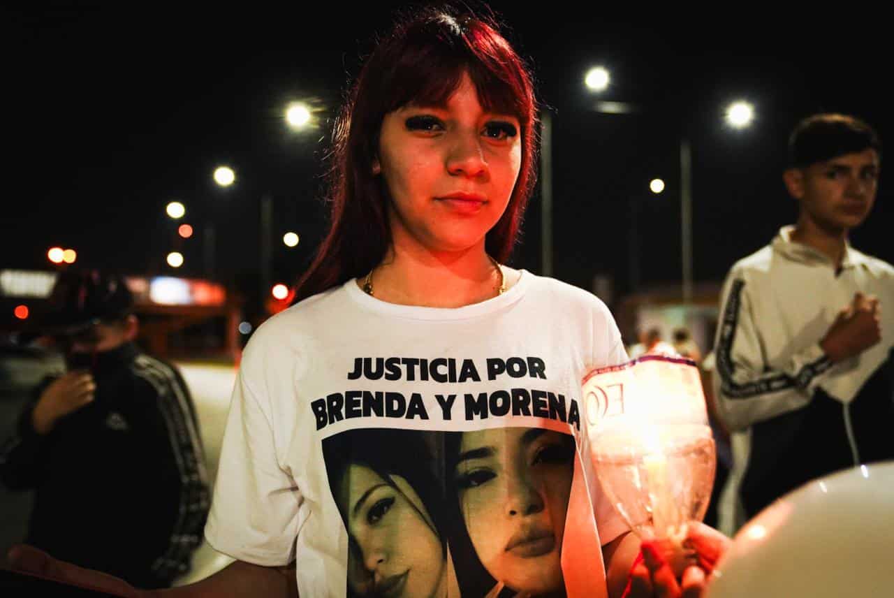 De a poco, desde los monoblocks que custodian esta rotonda bajo la mirada de murales del Papa Francisco y Diego Maradona, los vecinos fueron llegando. Algunos volvían de trabajar, otros se sumaban después de cenar. Hay jubiladas, adolescentes y muchos niños y niñas que sostienen velas en cuellos de botellas de plástico. Sabrina, la mamá de Morena, marcha mirando el frente. Paula, mamá de Brenda, lleva en brazos a su nieto de un año. Hay mucho dolor, y son los niños los que marcan con una mirada de fuego una fotografía fuera de lugar, una cámara que parece no respetar este duelo.