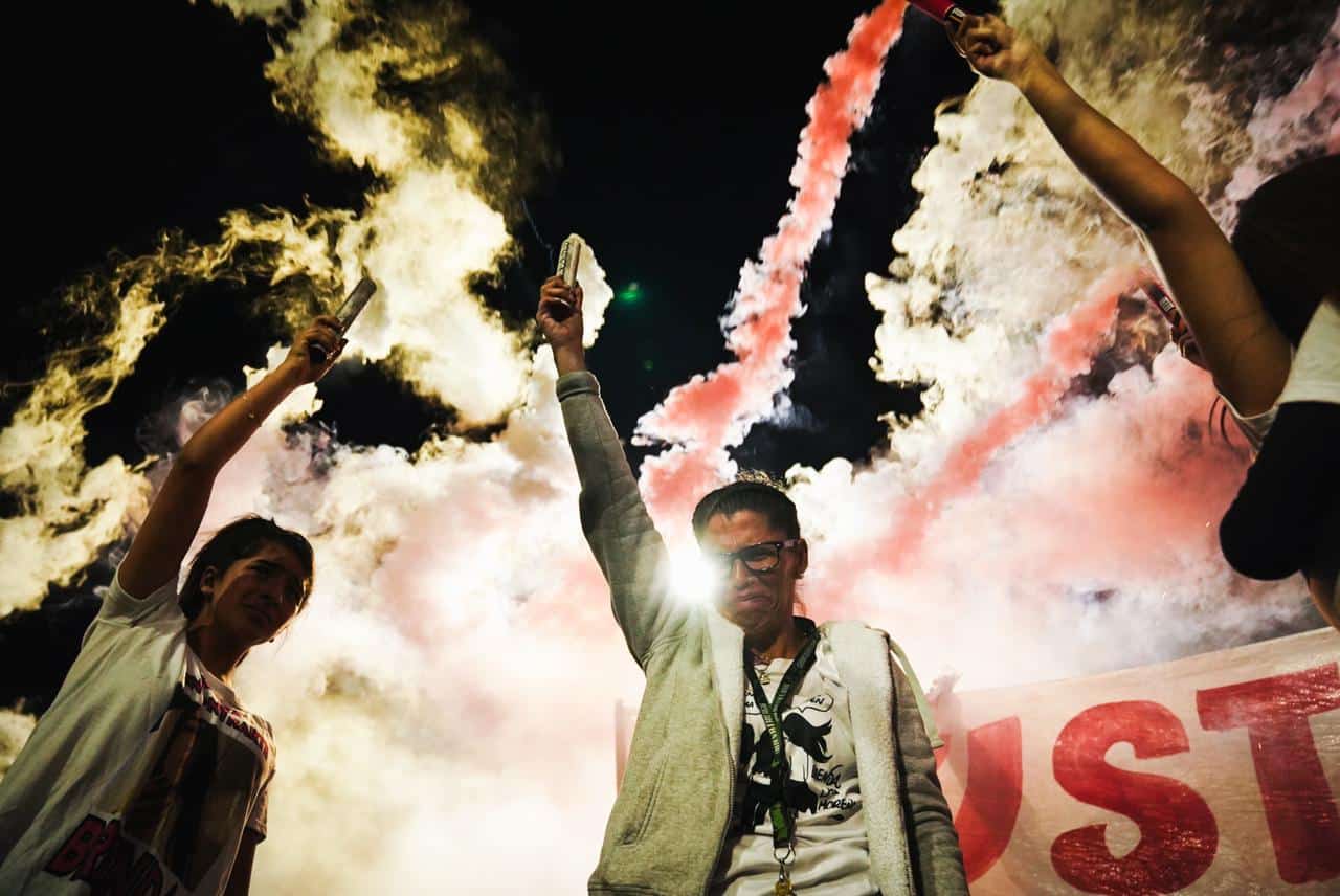 Las familias se reúnen y sacan bengalas y globos blancos que todo este barrio que marcha estuvo inflando durante la tarde. “Ahora”, ordena Sabrina, y los globos se sueltan.