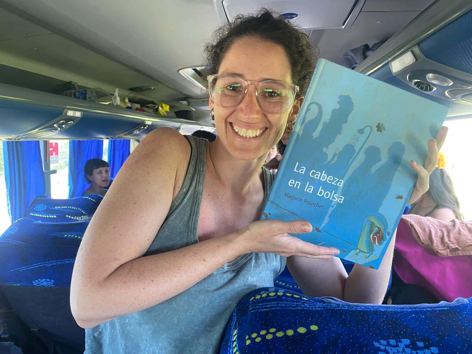Estamos todas sentadas en el piso superior del micro mientras una voz encantadora nos cuenta el cuento La cabeza en la bolsa, mientras recorre el angosto pasillo mostrando las ilustraciones que dan vida a esta historia que escribió Marjorie Pouchet: la de una chica rabiosamente tímida que siempre sale a la calle con una bolsa en la cabeza, hasta que un día, regado por sus lágrimas, crece allí un jardín. ¿Qué hará entonces con esa timidez y con esas flores?