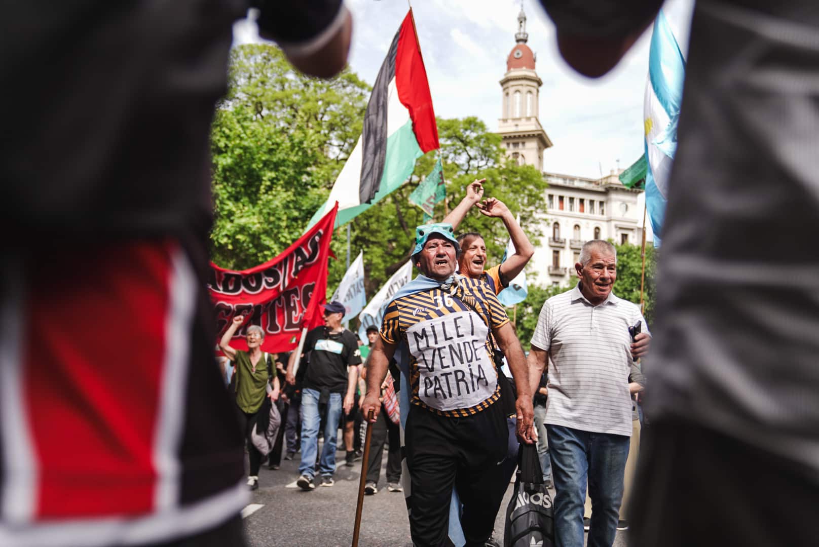 Sobre el cierre de la marcha, en uno de los varios actos que se armaron en esta plaza, Virginia, de Jubilados Insurgentes y megáfono en mano, describió que la crisis que el país está atravesando no es nueva: “Estuvo Krieger Vassena con Onganía, Martínez de Hoz con la última dictadura, Cavallo con Menem, Macri con Caputo y Sturzenegger, que son los mismos que ahora están con este energúmeno”. La línea de tiempo que hiló Virginia ubica ministros de economía con dictaduras y gobiernos constitucionales en épocas distintas, con un detalle que a su criterio sigue permaneciendo impune: “La economía neoliberal”.