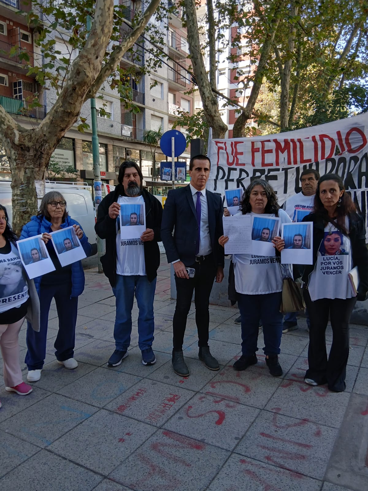 En la puerta del juzgado, familiares y manifestantes con el abogado Juan Pablo Gallego, que explica:“Estamos ante un caso en el que, por motivos que se desconocen o por relaciones de poder, se busca beneficiar a una persona claramente identificada como autor de un crimen que el Código Penal define como femicidio”.