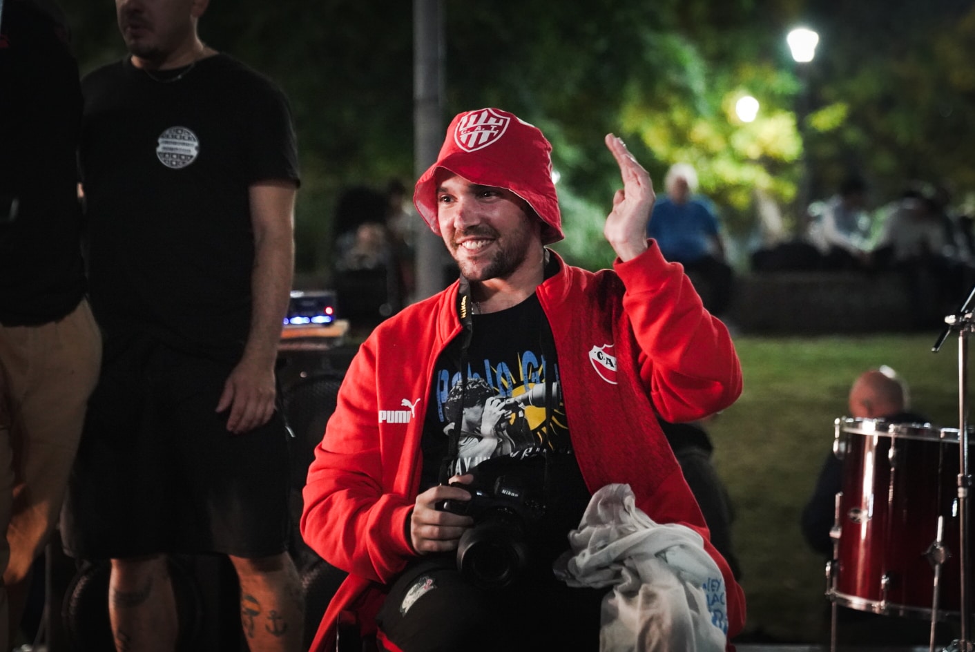 Pablo lleva puesta la chomba de su amado Independiente y un gorro Piluso de Remedios de Escalada, del que prende el pin con su foto icónica y la frase de su ídolo Ricardo Mollo sobre esa cámara de fotos que Bullrich y compañía buscaron que deje de disparar: “Un arma de creación masiva”.